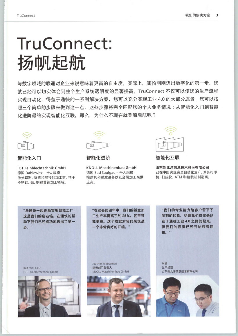 我們的任務(wù)在于進一步發(fā)展生產(chǎn)技術(shù)并實現(xiàn)數(shù)字聯(lián)網(wǎng),使其更加經(jīng)濟、精確而又面向未來。為此,我們希望更為高效地規(guī)劃生產(chǎn)及其上游和下游工作流程。我們由此努力打造未來工業(yè)世界。作為工業(yè)生產(chǎn)領(lǐng)域機床與激光器的市場及技術(shù)雙優(yōu)企業(yè),我們的各項創(chuàng)新幾乎影響著各行各業(yè)。我們的軟件解決方案為打造智能工廠鋪平道路,在工業(yè)電子領(lǐng)域?qū)崿F(xiàn)高科技工藝。