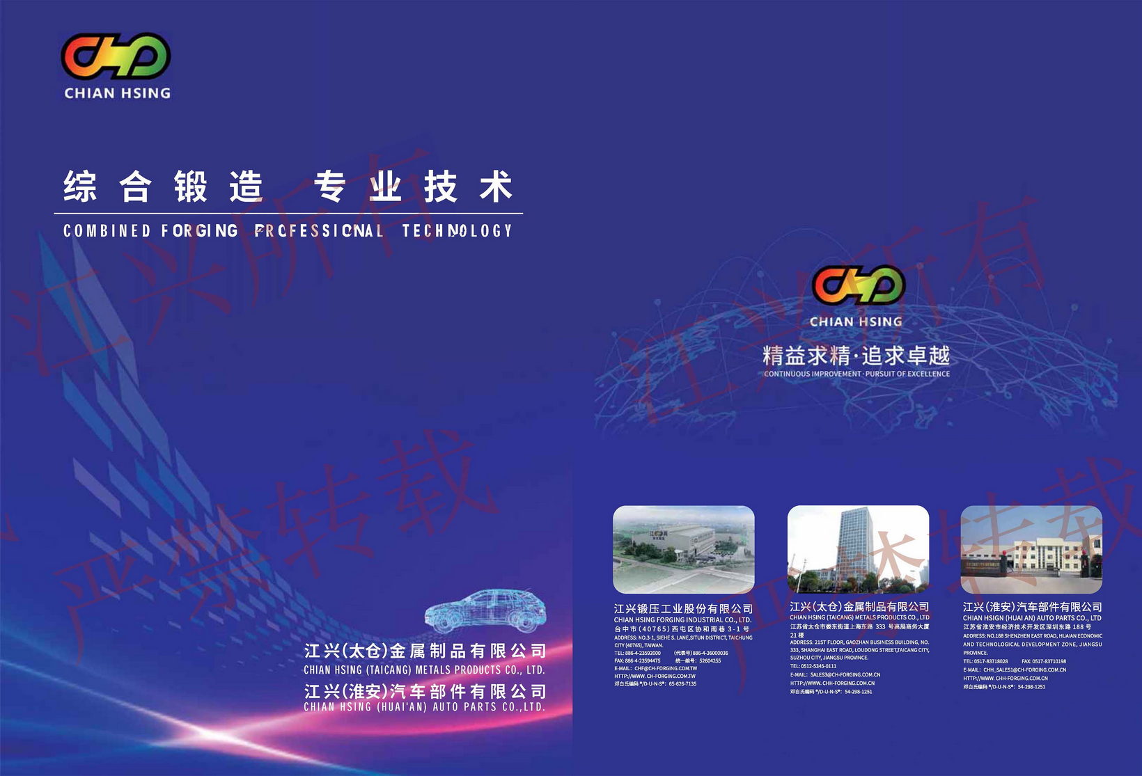 江興鍛壓工業(yè)股份有限公司自西元1971年創(chuàng)立以來,秉持著「顧客滿意、同仁樂意、經(jīng)營得意、永續(xù)經(jīng)營」之經(jīng)營理念,不斷開發(fā)綜合鍛造之技術,使本公司所生產(chǎn)的鍛品更優(yōu)良、更精密、更能減少切削加工,使鍛品更臻于理想。于1997年在江蘇省太倉市設立江興(太倉)金屬制品有限公司,以及2012年設立江興(淮安)汽車部件有限公司,延續(xù)臺灣總部的經(jīng)營理念和專業(yè)技能,持續(xù)在國內(nèi)發(fā)展并精進冷溫熱綜合鍛造技術。