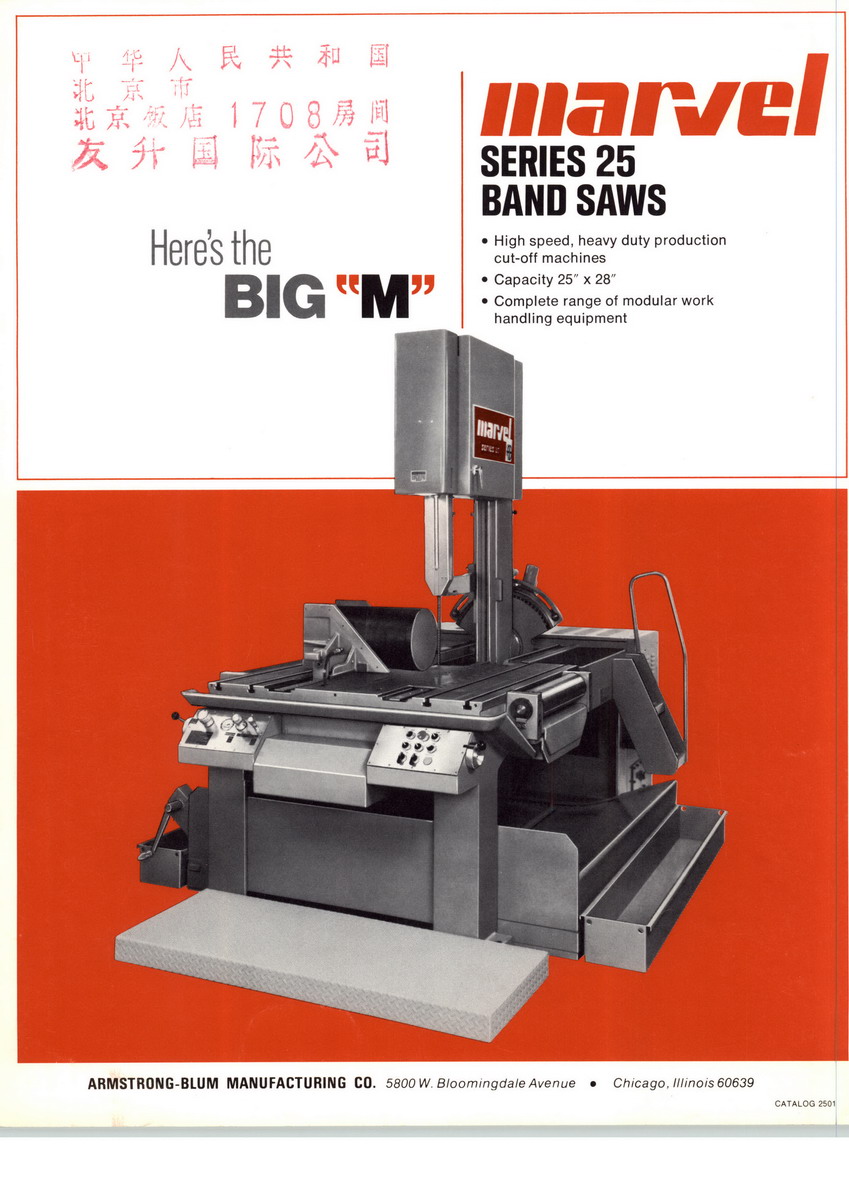 Marvel Manufacturing Company, Inc. offers a complete line of metal cutting saws and ironworkers under our MARVEL and SPARTAN trademarks. Marvel introduced the first vertical tilt-frame band saw in 1917 and remains the leader in the vertical tilt frame market. Our Marvel line of vertical saws ranges from the single cut universal Series 8 to our fully automatic programmable Touch Tech models with miter cutting up to 60 degrees. Our Spartan band saw line features both hinge and dual column band saw designs in capacities from 12 to 60 inches as well as a complete line of plate saws and contour saws. The Spartan brand name also includes high production thin kerf carbide circular saws and our Spartan Ironworkers which are available in capacities from 50 to 180 tons.