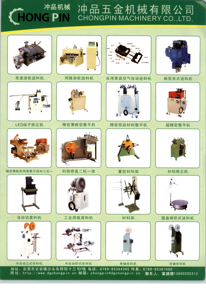 東莞市沖品五金機(jī)械有限公司創(chuàng)立于2004年1月,公司負(fù)責(zé)人經(jīng)過多年對(duì)沖壓周邊設(shè)備的摸索各學(xué)習(xí),專業(yè)成立了沖品機(jī)械有限公司。本公司專業(yè)從事五金沖壓周邊設(shè)備,整廠規(guī)劃制造銷售與維修。 代理“日本兄弟BROTHER”精密攻牙機(jī)、精密自動(dòng)空壓鉚釘機(jī);臺(tái)灣金上源油壓高速?zèng)_床及專用機(jī);臺(tái)灣彰年發(fā)空、油壓鉚釘機(jī)。 專業(yè)制造:沖床隔音箱、端子收料機(jī)、圓盤送料機(jī)、吸廢料機(jī)、材料架、整平機(jī)、油壓機(jī)等相關(guān)產(chǎn)品。 我們將一如繼往,秉持品質(zhì)、合作、服務(wù)之原則為您提供產(chǎn)品質(zhì)量全方位服務(wù),堅(jiān)持價(jià)格合理以質(zhì)取勝之原則期盼與您合作,也期待您的支持與惠顧。