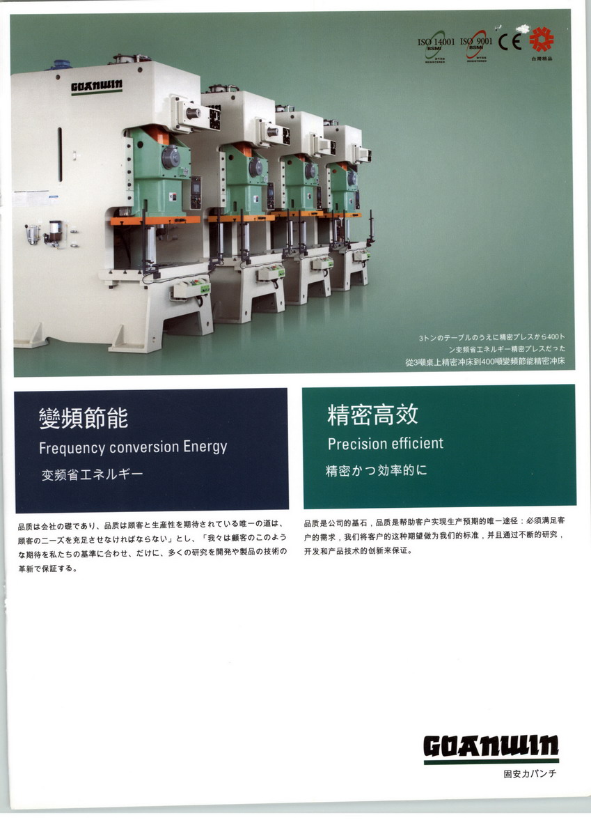 寧波固安力機(jī)械科技有限公司坐落于寧波市鎮(zhèn)海區(qū),是一家以現(xiàn)代企業(yè)管理為基礎(chǔ),堅持體制創(chuàng)新和產(chǎn)品結(jié)構(gòu)優(yōu)化,不斷推進(jìn)人才化戰(zhàn)略,培育具有自身特點的企業(yè)文化和核心競爭力,把企業(yè)建設(shè)成為具有更強競爭力的公司。公司主要產(chǎn)品是3噸-500噸規(guī)格的多款高速、精密沖床。公司嚴(yán)格執(zhí)行ISO質(zhì)量管理體系,努力追求產(chǎn)品的高質(zhì)量,以及令客戶滿意的售后服務(wù),與客戶共創(chuàng)卓越。